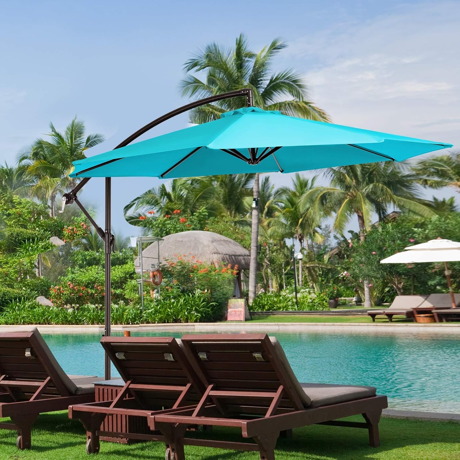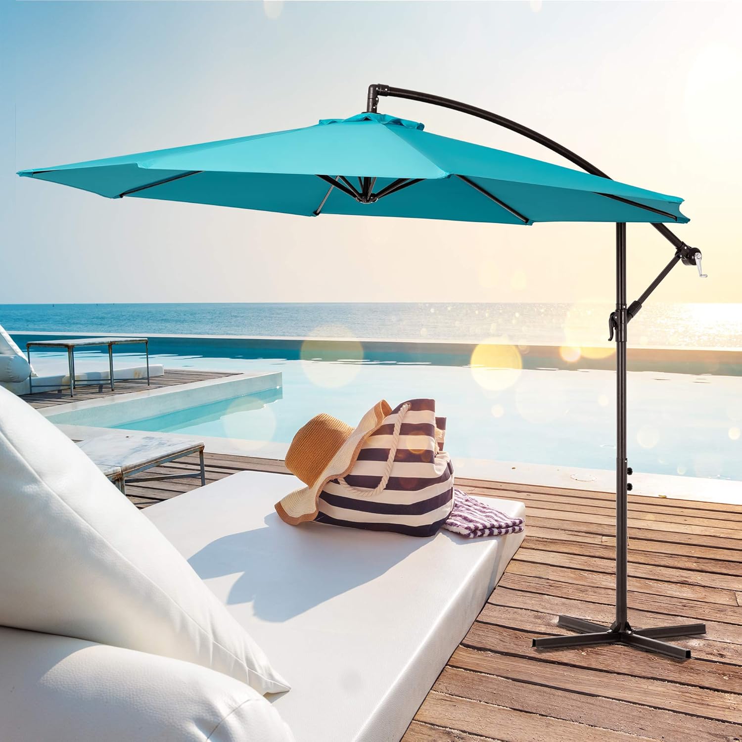 炎热的夏天阳光灼人,一定要有遮阳伞提供阴凉才好。这款遮阳伞足有10ft大小,可容纳 54" 至 66" 大小的桌子及4-6把椅子,面料能够有效隔热并100%阻挡紫外线,防水效果也很好,有多色可选,且颜色不易褪。骨架采用结实的铁质,可以抵抗恶劣天气,外表还有一层防锈涂层。开伞收伞的操作都十分简单,很容易操作。