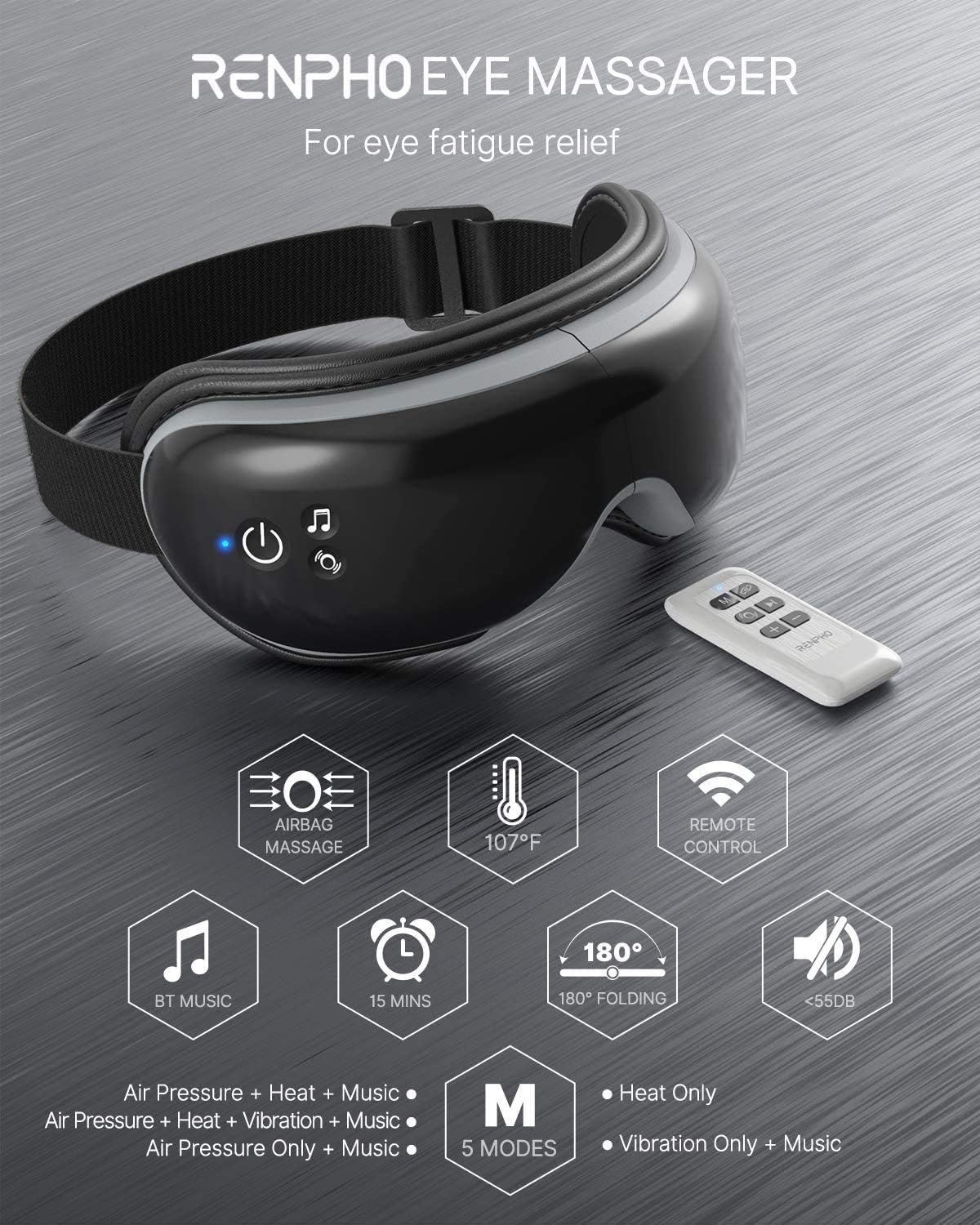 Renpho这款眼部加热气压按摩仪借由温热眼周肌肤来促进眼部周围的血液循环,达到舒缓肌肉紧绷的效果。其实血液循环不良,不仅会造成肌肉紧绷,还是导致眼部暗沉的主要原因之一。借由热敷功能,从此向熊猫眼说掰掰吧!这款按摩仪特别对应了眼睛周围的穴道做深层按摩效果,共有五种按摩模式,对应着不同时长,同时不同模式下均可调节热敷温度高低和气压强度。按摩仪还可以连接蓝牙对应到手机,或者,使用按摩仪内置的白噪音音乐,按摩热敷当下听着音乐沈沈睡去,评价相当优秀!随附遥控器。
